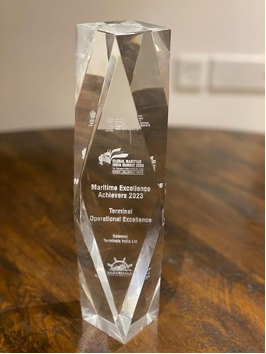 Mumbai - Gateway Terminal India [APM Terminals Mumbai] is proud to announce to have been conferred with the prestigious Maritime Excellence Achievers award 2023 under the category “Terminal Operational Excellence” at the recently concluded Global Maritime India Summit 2023. GTI management was honoured to receive this prestigious award by Shri Bhupendra Patel – Chief Minister of Gujarat in the presence of Shri Sarbananda Sonowal – Cabinet Minister of Ports, Shipping, Waterways, and Ayush, Shri Piyush Goyal – Union Minister of Commerce & Industry and other illustrious guests.