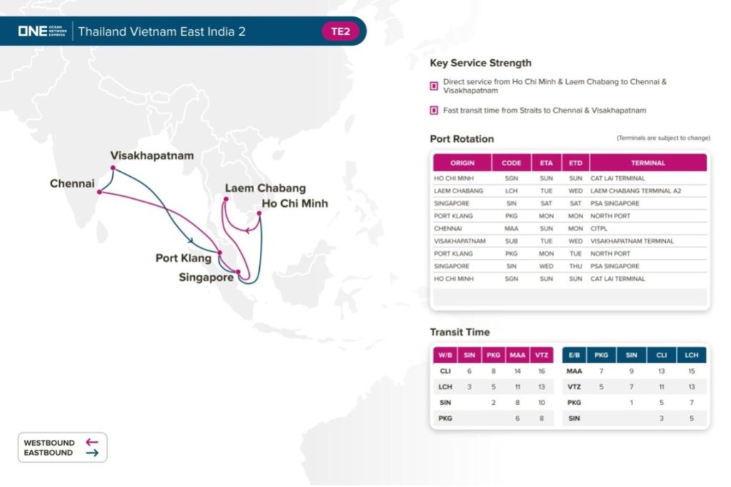 Singapore - Ocean Network Express (ONE) is pleased to announce the launch of the new Thailand Vietnam East India 2 (TE2) service. This service is an enhancement of the existing SVX service, maintaining connectivity between the Straits area and East India while further strengthening direct transportation from Cat Lai and Laem Chabang to East India. This improvement ensures reliable and competitive transit times.
